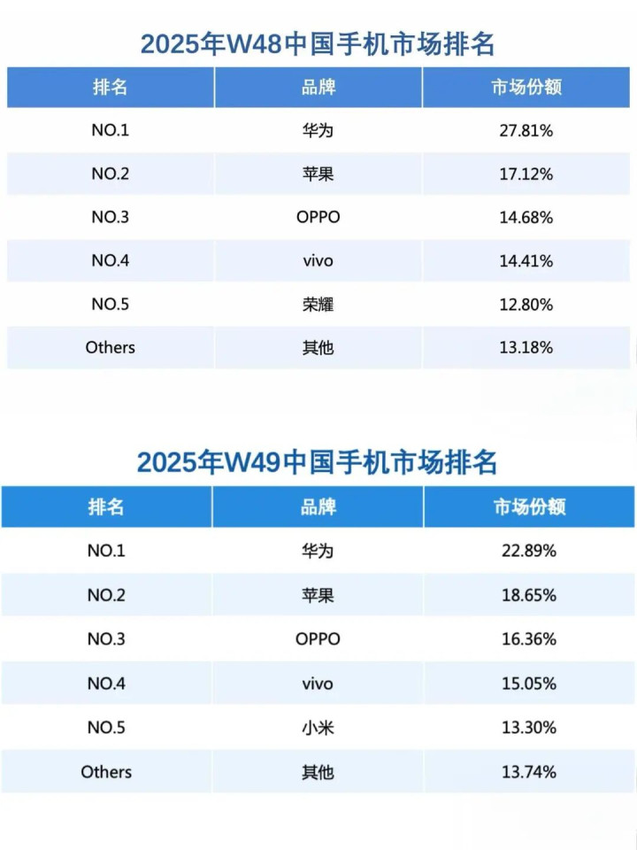 2025年第48周(11.24-30):市场份额达27.81%,领先苹果10.69个百分点。第49周(12.1-7):市场份额22.89%,超越苹果4.24个百分点。